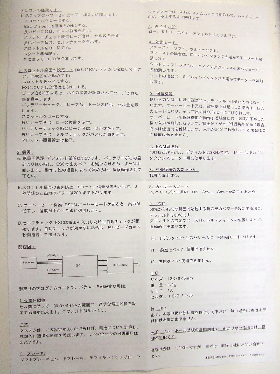 | >モーターは、ビープ音ではなく、 >配線を繋ぐと「プップップッ」と連続して >なりっぱなしになります。 http://www.endeavor-team.com/kob/rc/WebShopKb/s-ct7-2.jpg 説明書を見るとセルフチェックをパスしないときの音と読めますが違います? その際どうしろとは書いてないですが。バッテリーは何個か試してみましたか? |