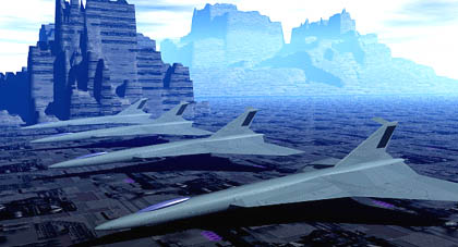 これはウルトラセブンに出てくるウルトラホーク似ですね。 六角大王でモデリングしたウイングと楕円を合わせた物です。 奥に遺跡の様な物がありますが、 これは(Bryceではいつもそうですが) わざわざモデリングしたわけではなく、グレースケールを モザイクや浸食などのボタンを押して、適当に遊んだ結果です。