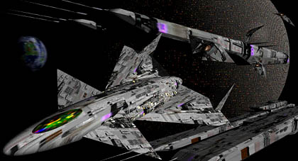 ドックファイトですね。 映画の1シーンのようです。 追われている方はシャトルで、追っている方はダブルデルタ戦闘機 その後ろには二隻の大型空母があります。 灰色の星がありますが、実はエイリアンの人工惑星で 私の作ったゲームARIUS-Vで最終面にあの中のボスと 壮絶な戦いをすることになります。