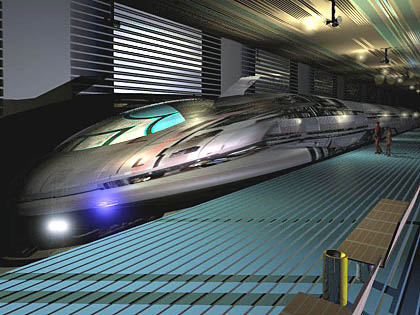 テレビでたまたま新幹線のニュースをやっていたのを見て 無性に作りたくなって、作っちゃいました。 時間のかかるややこしいモデリングはしてません。 引き延ばした球体を4つほどくっつけて、後ろに円柱をつないだだけです。 それにいつもの魔法のテクスチャーを、はりつけました。 ちなみに、乗り込もうとしている二人は 透明な板に、あらかじめレンダリングした人物を貼った物です。 ホームページには載せてませんが、アニメーションでは爆走しています。