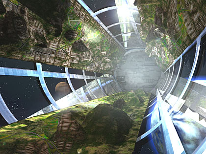 ガンダムで出てきたタイプのスペースコロニーです。 物語に出てくるのと同じように 三方向に開いたミラーで太陽光線を反射して 内部の陸地を照らそうとしたのですが、どうしてもうまくいかず 結局、中にライトを入れてしまいました。 ところで、 Bryceでちゃんと作動する天体望遠鏡を作った人がいるそうですが、 覗いてみたいですね。