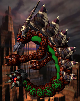6面のボス、クリーチャー <Skull Scorpion>です。 自分の幼虫と卵を破壊されるため、 逆上してプレーヤーに襲いかかります。 さすがに6面ともなるとボスもかなり手強くなります。 動きも早く攻撃も強力です。 特に背中から出てくるウェーブには注意をしましょう。 頭の位置に正対して タメ撃ちを繰り返すことが攻略法です。