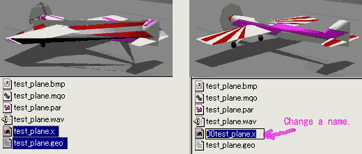 Too big model data will make slow frame rate and disturb smooth flight. Too much polygons and huge bmp-file are not good. (I recommend you to use only one bmp-file in 256 x 256) |