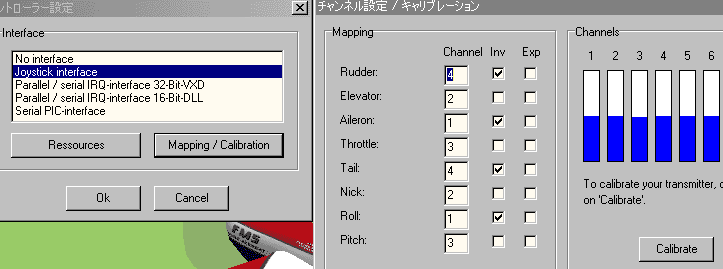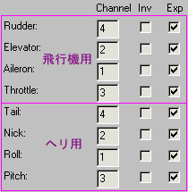 FMSのキャリブレーション画面でExpにチェックを付けると スティックの中心付近の舵の動きをマイルドにします。 送信機を繋いだ場合、お使いのコンピュータ環境やアダプタの種類によっては、 ほんの少しピクつきが発生することがあります。 |