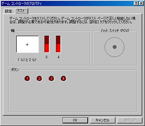 ★リアルフライト付属のプロポ型ジョイスティックが使えます。 ウインドウズのコントロールパネルを開き、 ゲームコントローラーをダブルクリック、 リストにそのジョイスティックがあるか見て下さい。 リストにある場合は文字をクリックして選択し、 プロパティのボタンを押します。 テストでジョイスティックを動かすと画面の + が 正常に動くことを確認したら、FMSでジョイスティックを選んでください。 注)リアルフライト付属の送信機を繋ぐためのアダプタでは動きません。
