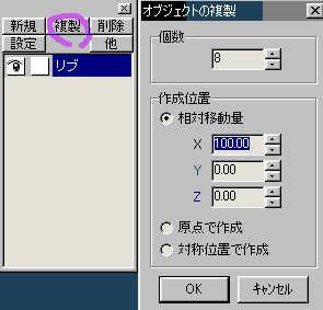 複製ボタンを押し、個数とX方向の移動量を入れOKを惜します。