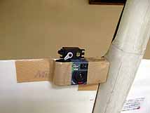 サーボがシャッターを押すように 位置を合わせて両面テープで固定します。 ホーンの動きをよく見てサーボに無理がかからないようにします。