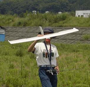 敏感なエレベーターとスピードが速いためKAZさん必死!(笑) 前に少し重りを付けて垂直尾翼をカッターで切ってみました。