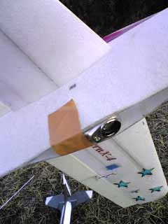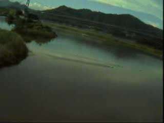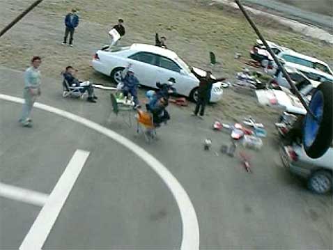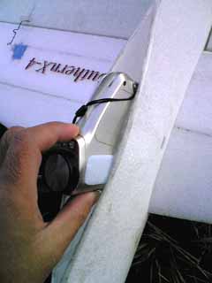 ムービーカメラによる空撮 サンヨーのムービーカメラDMX-C4の激安中古品(傷物)を買いました。 http://www.sanyo-dsc.com/products/lineup/dmx_c4/index.html 小さくて軽いのですが、さすがに本格的なカメラなので画質はかなり綺麗ですね。 http://plusd.itmedia.co.jp/pcupdate/articles/0409/08/news044_3.html 重量はバッテリー込み180g程度ですから SouthernX-4に積んで飛行できるかもしれません。 o(^-^)o オークションで型遅れや傷物を探せば、お手ごろ価格で手に入ります。 http://search3.auctions.yahoo.co.jp/jp/search?p=DMX+-DB-L&auccat=23936&f=0x2&alocale=0jp&mode=2&abatch=2 画質について DMX-C4は基本的に「動画も撮れるデジタルカメラ」と言う位置付けのようです。 静止画はとても綺麗ですが、動画はDVテープに記録する 通常のデジタルビデオカメラには少々劣るようです。 特に動く対象物の場合はブレが発生しやすい感じがします。 これは内部処理スピードの関係か、MPEG-4形式の圧縮方法の仕様なのかもしれません。 とはいえ、RC飛行機に簡単に搭載できるカメラとしては 圧倒的に高画質なのは間違いないでしょう。 あまり動かない対象物は非常に綺麗に撮れます。 最近ではフルハイビジョンのモデルもありますから、 その気になればホームレベルでの究極の高画質映像をRC機で撮影する事も可能でしょう。 http://kakaku.com/item/10067610062/ 静止画サンプル 画像をクリック 最高画質で撮影した写真を、モニター表示用に半分のサイズにしたものです。 空撮テスト カメラにマジックテープを貼り、SouthernX-4の胴体下の重心位置に固定することにしました。 そのままでは着陸時などの衝撃でカメラが落ちる可能性があるので、ガムテープで補強してあります。 このカメラは電源を入れたまましばらく経つと、すぐにスタンバイ状態になるようなので、 録画を続けながら固定作業を行いました。(^_^;) 「この程度の重量なら飛ぶだろうな」とは思っていましたが、 スロットル70%程度での手投げであっさりと上昇していきます。 フルスロットルにするともう少しで垂直上昇できそうな余裕があり、予想以上でした。 操縦性の悪影響もそれほど無いようです。 o(^-^)o