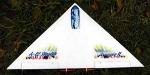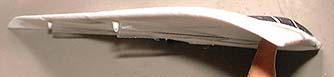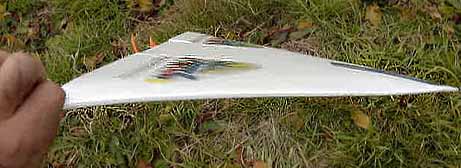 翼には少しカールダウンが付いています。 紙飛行機で実験したときに、 こうすると飛躍的に飛行性能がアップすることを発見しました。 なぜなのかはよく分からないのですが、 イメージとしては空気を抱え込むような感じになるからでしょうか?