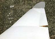 ブーメラン型全翼機ナスカが、翼だけで大変良く飛ぶので、 「もしかして"自作エリプスJr"の翼も飛ぶかも」と思い立ち、 バッテリーと受信機をテープで留めて実験してみました。 後退角が全くないので、風見効果が望めないため垂直安定板だけは付けました。