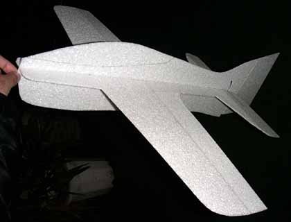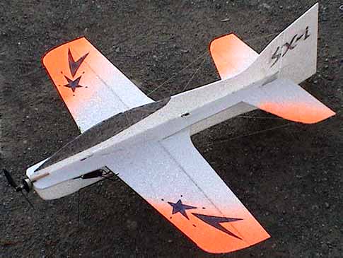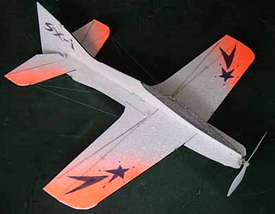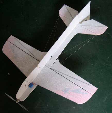 交差させて胴体に糸で縛り付けてあります。 完成! 大体ショックフライヤーと同じサイズで、(少しスパンが短くて全長が長い)