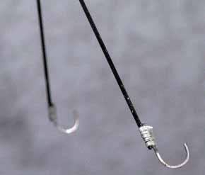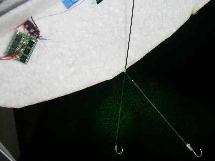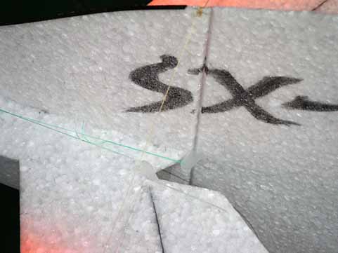 重量はコネクター込みで14.5gです。 マウントを省略し、機首に糸で縛り付けます。(笑) リンケージ 軽量化のため、すべてのリンケージは極細PEラインによるワイヤーリンケージです。