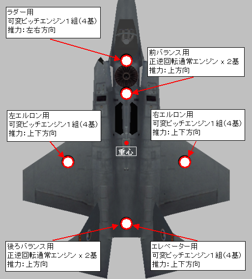 20基のエンジンの推力は全て上下左右に吹き出され、また前進用のエンジンは